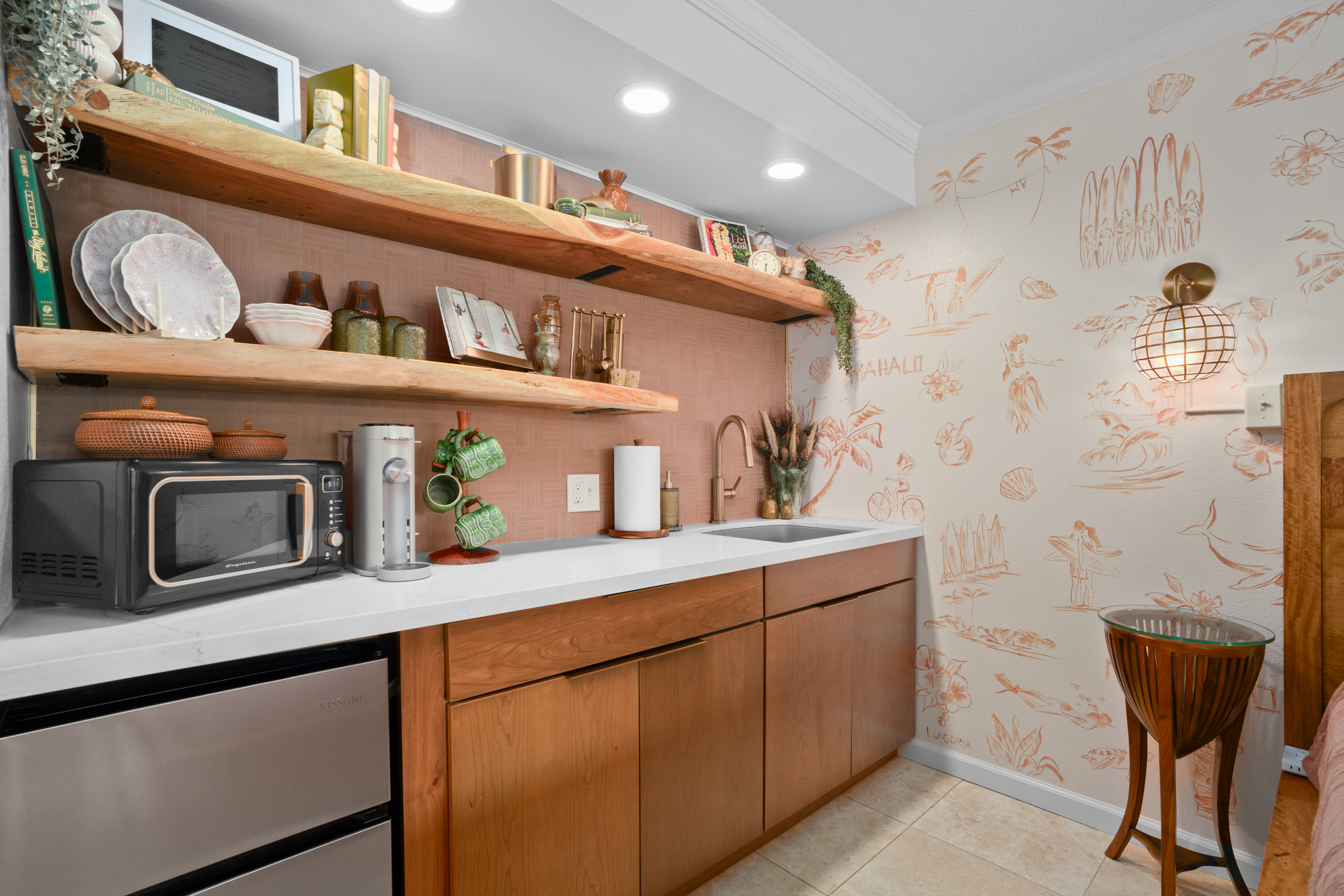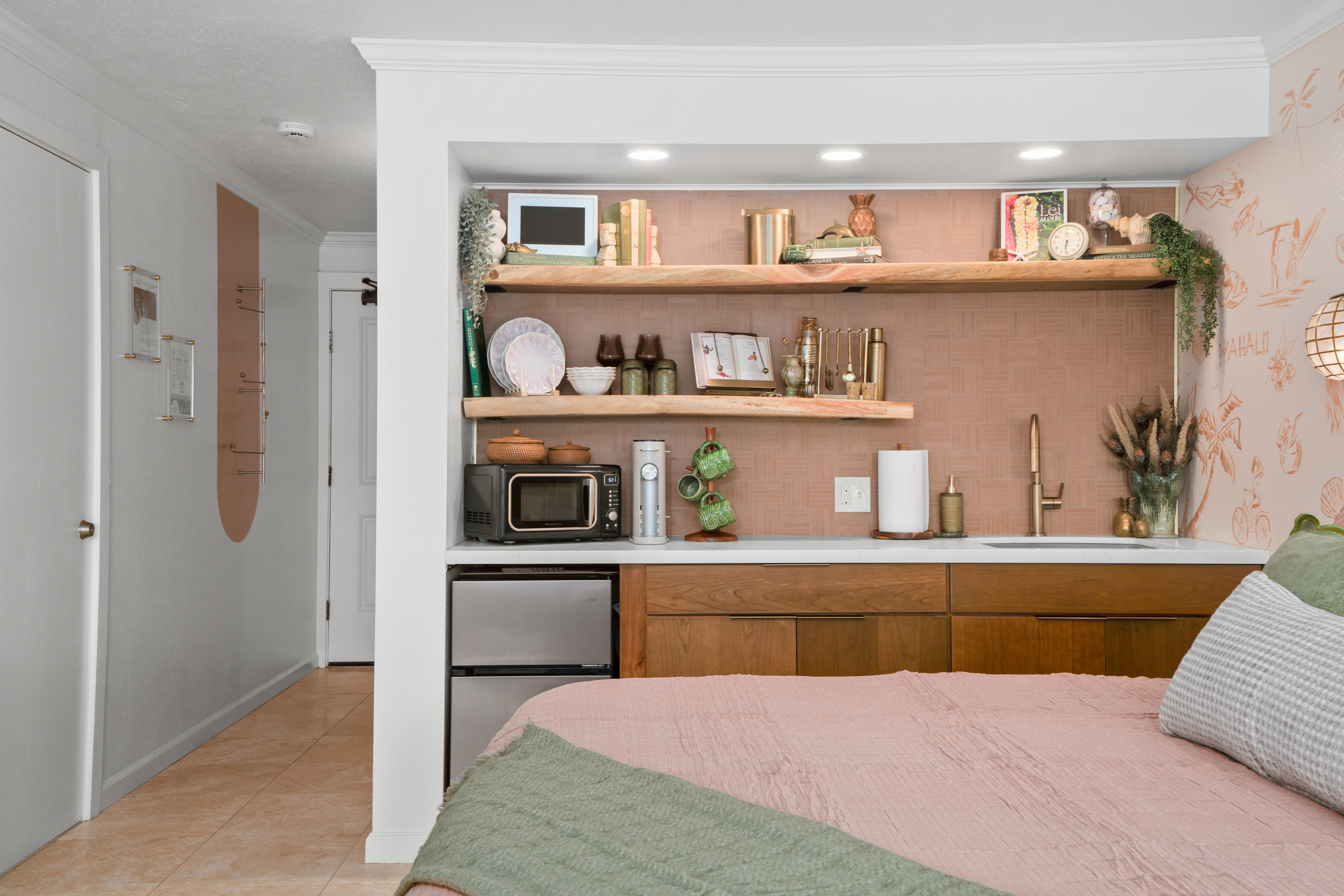 The kitchenette provides everything you would need for a comfortable stay. Enjoy a stocked kitchen including microwave, toaster, Ninja Coffee maker (which allows for K-Cups or drip coffee), and blender. Cooking is limited in the unit due to the lack of stove, however BBQ grills are available on site if you want to cook a meal. You can certainly enjoy some drinks during your time at Islander by serving as your own bartender with our bar setup and cocktail book or have someone else make you drinks at the full Tiki bar located by the pool!